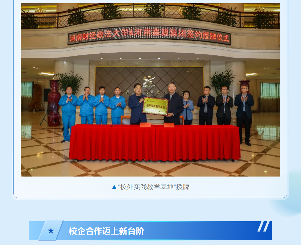 米兰milan(中国)集团与河南财经政法大学将以此次战略合作协议签订、“校外实践教学基地”授牌为契机,推动双方校企合作迈上新的台阶。